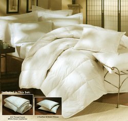 SIZE: King 102x86COVER/SHELL: 233 Thread Count, 100% CottonFILL TYPE: Duck DownFILL POWER: 550FILL WEIGHT: 32 ozCONSTRUCTION: 10 inch End to End Sewn Through Box PIPING: Double stitchSET INCLUDES: 2 Standard size 20x26 95/5 Waterfowl/Down 32 oz PillowsCOLOR:WhiteHypoAllergenic, Dry CleanImported Weight: 9.0 lbs.A good quality down comforter will provide warmth, serve as a natural insulator keeping in your body heat, be allergy free, and last but not least, make for a cozy, inviting bed. To ensure its long life, a down comforter should be used with a duvet cover. Not only will this protect the down from dirt and impurities, it will allow you to introduce change, color and style into your bedroom. There are three key elements to look for when choosing a down comforter. They are FILL POWER, THREAD COUNT and BAFFLED. FILL POWER: The quality of down is measured by its fill power. Down with a higher fill power will be lighter, fluffier and loftier making the comforter cloud-like. Higher fill power will also provide better insulation. THREAD COUNT: This is the number of threads per square inch. A higher count provides a softer, more durable product. It also keeps dirt from getting in, and down from sneaking out of your comforter. BAFFLED: Baffling is simply a type of construction, specifically sewn in cloth walls to keep the down from shifting and clumping. Down and feather-filled products are packed tightly during shipping. Upon receipt, remove them from their packaging, fluff gently, and allow several hours to recover their full loft. In addition, being sealed in plastic packaging sometimes causes the scent of these natural products to concentrate to a disagreeable level. A few hours of airing usually removes the odor.