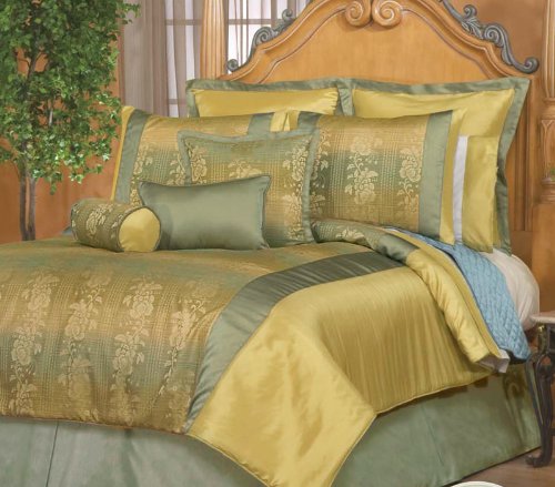 Give your bedroom an elegant look with this rich, exquisite collection. The comforter features gold flowers and woven stripes on sage ground. 3 decorative pillows included.