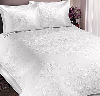 Center design Matelasse bedspread with plain hem finish and rounded corners.
