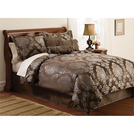 - "Hearth" brown and tan damask comforter set. Jacquard woven polyester and cotton face.