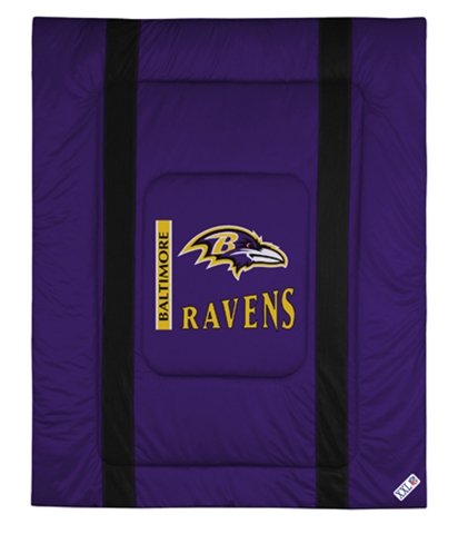 Baltimore Ravens bedding, bedspread. This oversized Baltimore Ravens comforter by Sports Coverage Inc. is from the Locker Room Collection. Filled with bonded polyester batting. The comforter itself is made of colorfast, soft and wrinkle-free polyester jersey. The reverse side is a gray and white cotton blend generic print. Twin size measures 66 x 86 inches. Full/Queen size measures 86 x 86 inches. Don't forget to check out our matching sheets, pillow shams, and draperies.