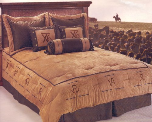 High quality, luxury super oversized comforter set features an overstuffed micro suede with embroidered branding and barb wires designs around the edge with corded rope edge. Two matching decorative pillows in micro suede with embroidered branding in the center, brass conchos on the border. Neckroll in mioroseude with embroidered barb wire design on the sides and brass conchos with frayed treatment on the ends. Pillow shams are also micro suede with center of distressed faux leather. Matching brown micro suede dust ruffle.
