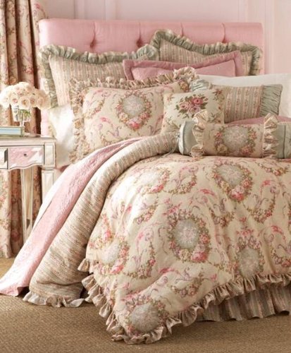 From Ma Maison Annabelle. The vintage romance of delicate florals and woven matelasse in soft shades of rose, blue and ivory brings a decidedly French appeal to this comforter set. The comforter which reverses to stripes is ruffled on three sides, the shams have a double ruffle and the striped bedskirt has a 17-inch drop. The set includes comforter measuring 92 by 96, 2 standard shams measuring 21 by 27 and a bedskirt measuring 60 by 80. All components are cotton/polyester. Dry clean only.