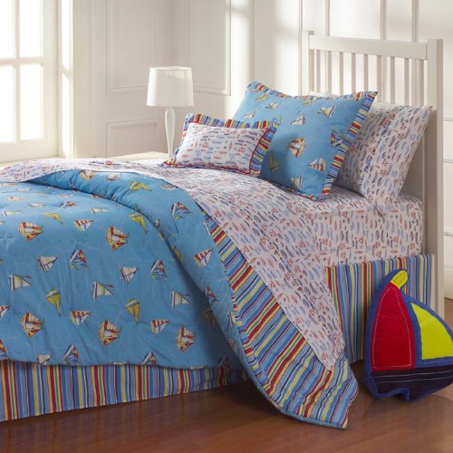 This 7-piece bedding collection has everything you need to wake up any kid's bedroom decor and give it a complete new look. Perfect for children of any age, this children's bedding set features regatta of sailboats on blue base. Reverses to stripe pattern offering two different looks in one. Full Comforter set includes comforter, two standard sham, one fitted sheet, one flat sheet and two pillowcases. Available in full size. 100% Cotton. 100% Polyester fill. Full comforter measures 86x86".> Regatta 7-Piece comforter Set by Freckles.> Features regatta of sailboats on blue base.> Reverses to stripe pattern offering two different looks in one.> 100% Cotton. 100% Polyester fill.> Full comforter measures 66x86".> Full comforter set includes one comforter, two standard shams, one fitted sheet, one flat sheet and two pillowcases.Care Instructions: Machine Wash.