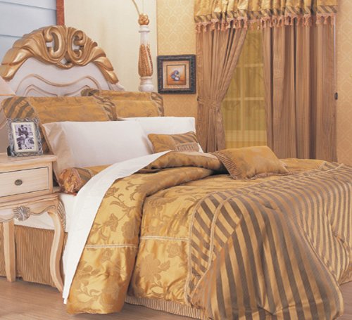 Treat yourself, and your bed, to total luxury tonight! Treat yourself like royalty as you sleep and dream with this beautiful and luxurious Candide 15-piece Comforter Set with Curtains! Textured fabrics in a mix of wonderful bronze, gold and silver tones. Face, back and fill made of 100% polyester. Dry clean only.