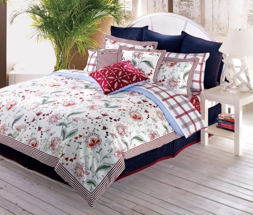 Tommy Hilfiger Cold Spring features garden botanicals embroidered in multicolor florals with crisp red, white and navy accents. The Comforter and Duvet sets feature 1-Comforter (Duvet with Duvet set) and set of Standard Shams (1 standard sham included with the Twin size and King shams includes with the King size). The 300-Thread Count cotton Sateen sheets feature and red and white oversized windowpane plaid with a one inch binding at the edge. The Comforter/Duvet feature printed and embroidered multicolor floral on a cream with red and white striped cuff at the edge reversing to Ithaca stripe. The bedskirt is a navy and cream ticking stripe. Layer in the 100-percent cotton quilted coverlet in red with floral cutout design. Complete the bed with the decorative pillows for a finishing touch to your room.