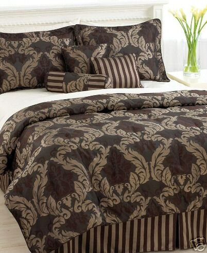 Evoke the extravagant elegance of an English manor house with the Devon comforter set. The dramatic comforter and shams boast overlapping scroll patterns in an ornate leaf jacquard that beautifully coordinates with the striped bedskirt and decorative pillows.