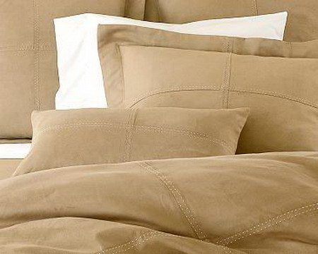 The FEEL and TOUCH of SUEDE without the expense! and easy care! machine washable! This stunning Duvet Cover Set has been created for ultime Softness and Comfort. A beautiful subtle White Top Stitching on the Duvet and Shams boost the Rich Suede appearance and gives a Tailor Look. Awesome!!! It reverses to a Camel/Tan microfiber fabric.